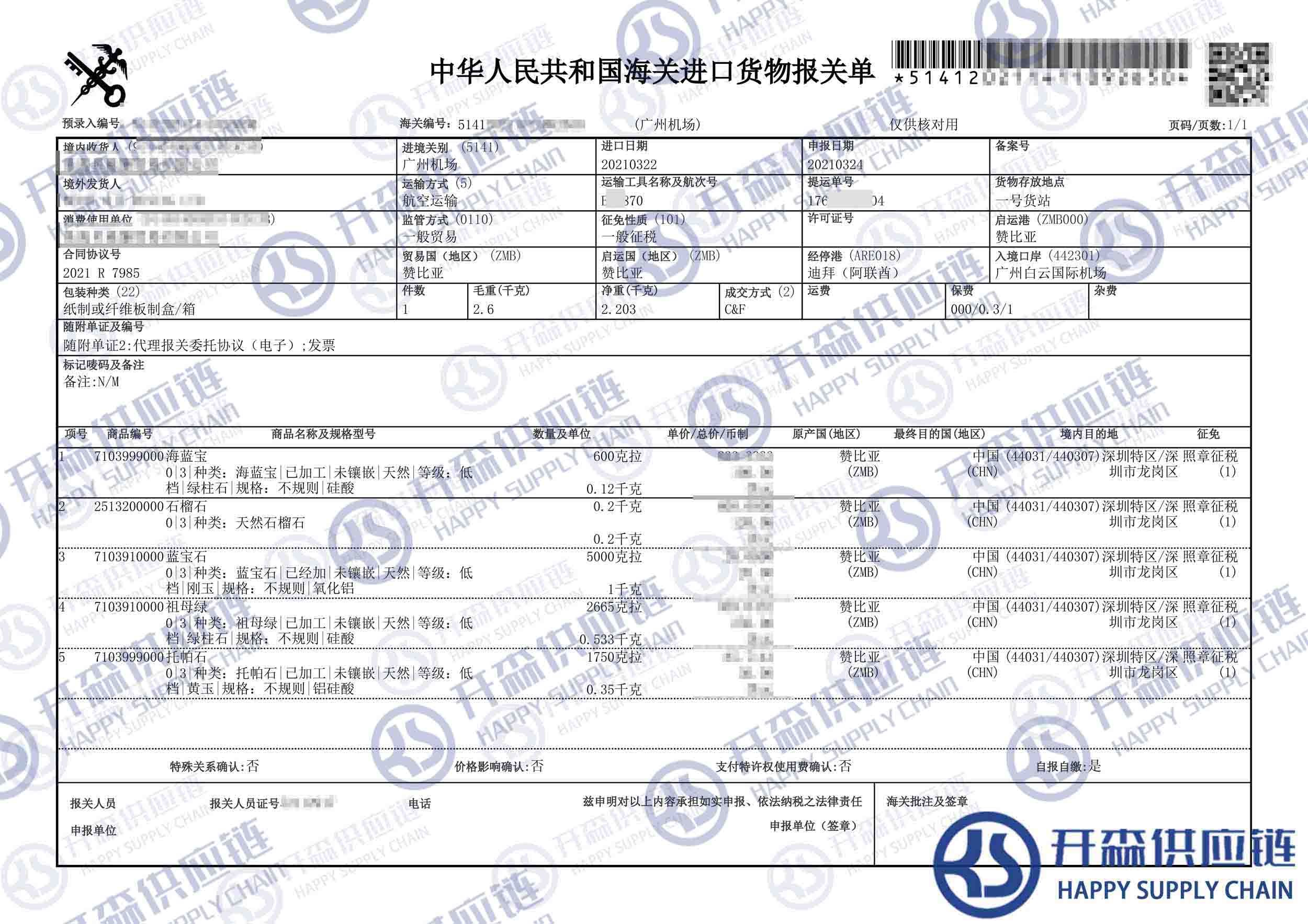 【本文結語】 上述就是贊比亞藍寶石進口報關代理案例【經典案例】的全部內容,希望能對您有所幫助,如有寶石進口報關上任何疑問及問題可隨時在線聯系我們或撥打 18002611553,開森供應鏈擁有豐富的寶石進口報關操作經驗及案例,10余年進口經驗為您所用,各類進口疑難都能為您一一解答及協助快速處理解決!