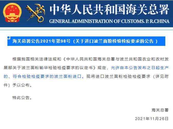 2021年11月26日,海關(guān)總署公布2021年第98號公告:允許自本公告發(fā)布之日起生產(chǎn)的、符合檢驗檢疫要求的波蘭面粉進(jìn)口。