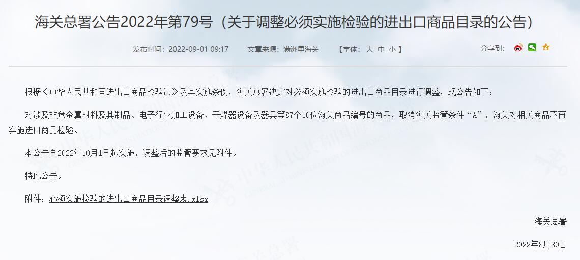 海關總署公告2022年第79號(關于調(diào)整必須實施檢驗的進出口商品目錄的公告)
