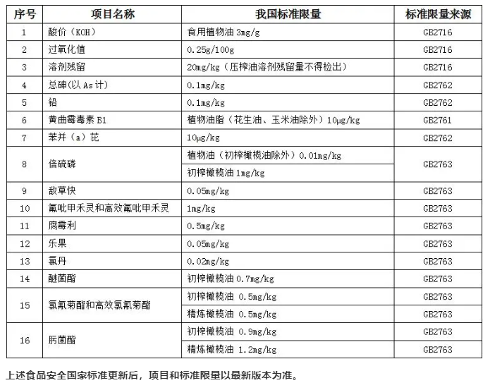 進(jìn)口食用橄欖油食品安全衛(wèi)生指標(biāo)應(yīng)該符合現(xiàn)行的GB2716《食品安全國家標(biāo)準(zhǔn)植物油》、GB2761《食品安全國家標(biāo)準(zhǔn)食品中真菌毒素限量》、GB2762《食品安全國家標(biāo)準(zhǔn)食品中污染物限量》和GB2763《食品安全國家標(biāo)準(zhǔn)食品中農(nóng)藥最大殘留限量》等,現(xiàn)將部分相關(guān)衛(wèi)生指標(biāo)和強(qiáng)制指標(biāo)梳理如下: