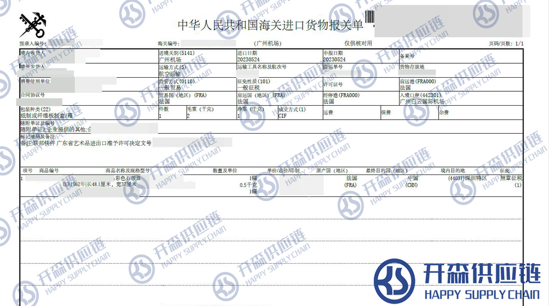【本文結語】 上述就是法國彩色石版畫(古物)進口報關清代理服務【經典案例】的全部內容,希望能對您有所幫助,如有油畫進口報關上任何疑問及問題可隨時在線聯系我們或撥打 18002611553,開森供應鏈擁有豐富的油畫進口報關操作經驗及案例,10余年進口經驗為您所用,各類進口疑難都能為您一一解答及協助快速處理解決!